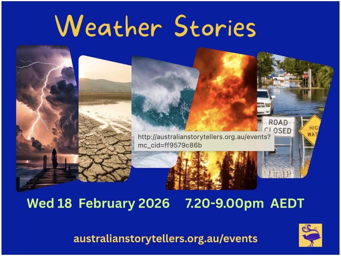 If you would like to tell a prepared story in 5-6 minutes, email Christine Carlton at storyaus@gmail.com to be put on the list to tell a short ‘Weather Story’. The stories are told, not read.