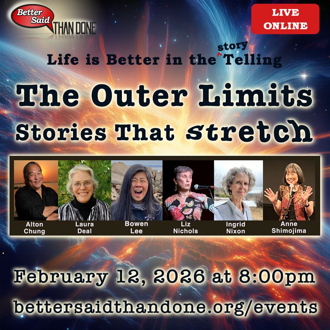 Better Said Than Done presents “The Outer Limits: Stories That Stretch,” with emcee Alton Chung and storytellers Laura Deal, Bowen Lee, Liz Nichols, Ingrid Nixon, and Anne Shimojima.